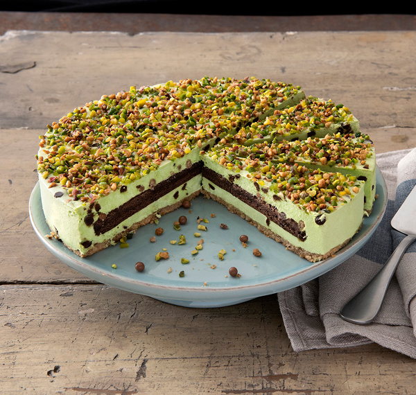 Premium-Dessert aus Pistaziencreme, Schokolade und Haselnussbiskuit – ideal für Buffet & Patisserie. -