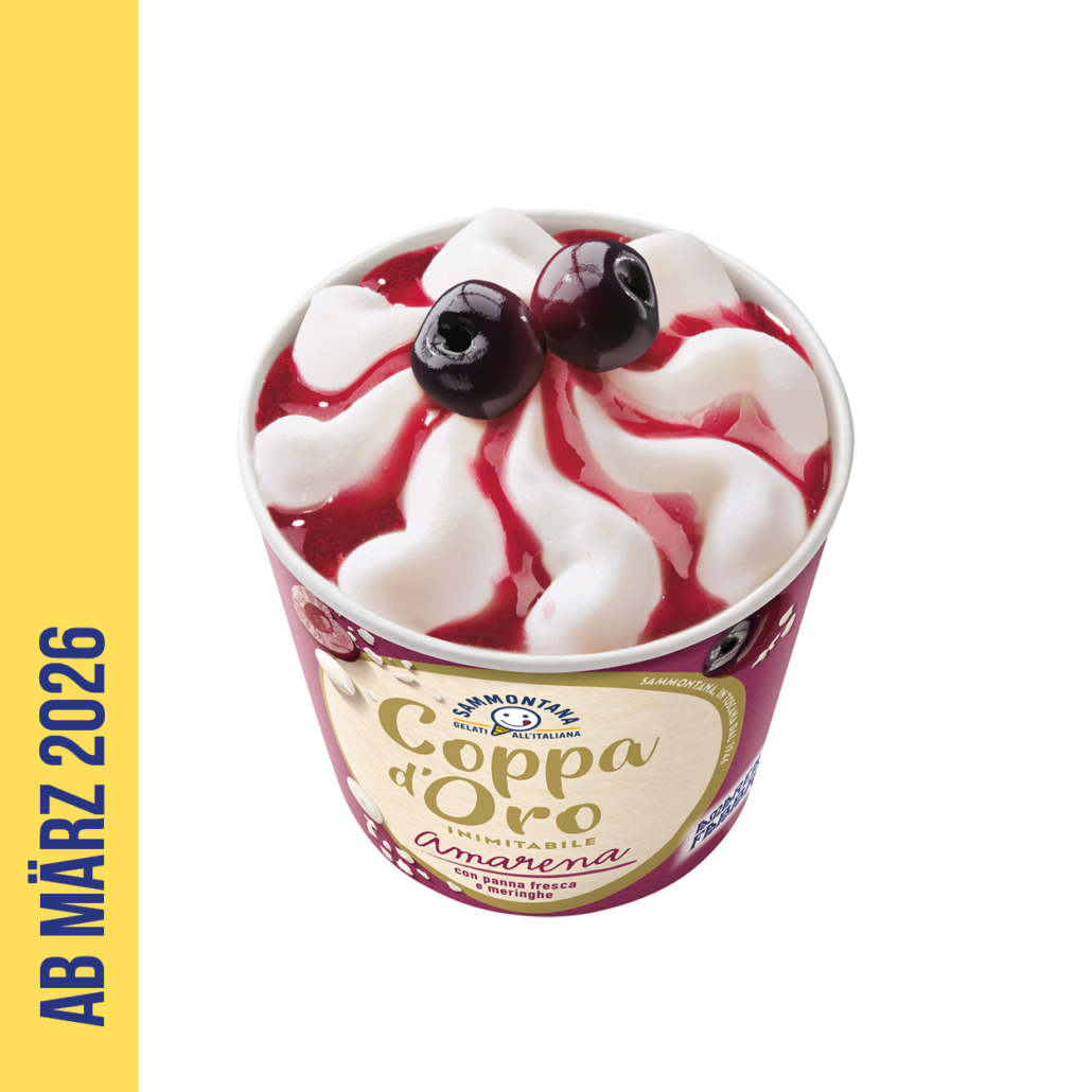 Die Coppa d’Oro Amarena steht für echten Genuss in bester italienischer Tradition. Cremiges Eis mit Vanillegeschmack trifft auf frische Sahne und luftiges Baiser – harmonisch durchzogen von intensiver Sauerkirschsauce. Das Highlight: Die Garnitur mit original Amarena-Kirschen von Fabbri, bekannt für ihre unvergleichliche Qualität und ihr fein-süßes Aroma. Ein impulsstarkes Dessert mit Kultcharakter, das in keiner Eisvitrine fehlen darf.