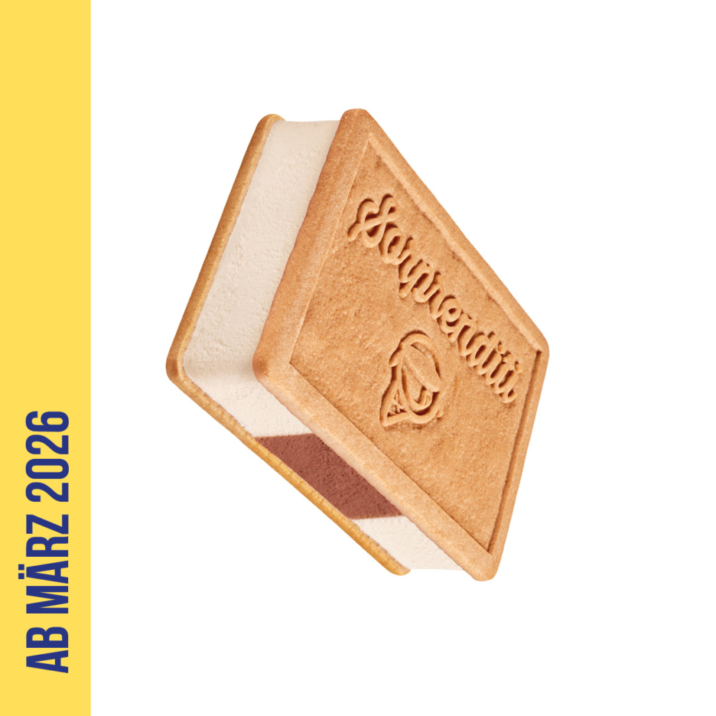 Duetto|Kakaoeis und Eis mit Vanillegeschmack zwischen zwei Biskuitkeksen